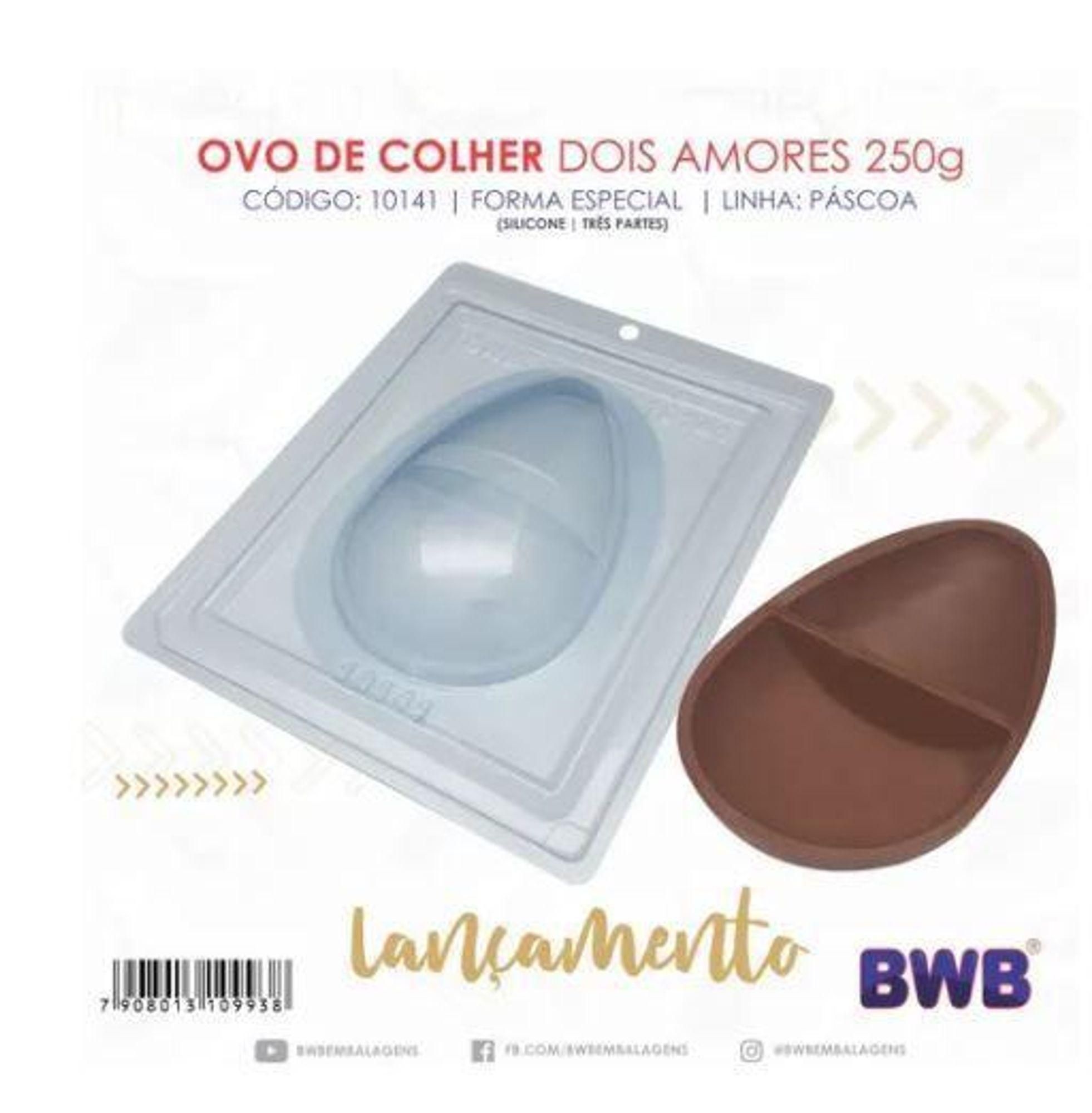 Forma Especial Ovo Dois Amores – 1 Unidade BWB Forma composta por 3 partes sendo 2 de acetato e 1 de silicone. Ficha técnica do produto: – 24 cm comprimento; – 18 cm largura; – 5 cm altura; – Peso da casquinha: 100g – Peso Junto: 250g – 1 Cavidade *Imagem ilustrativa *Informações de responsabilidade do fabricante